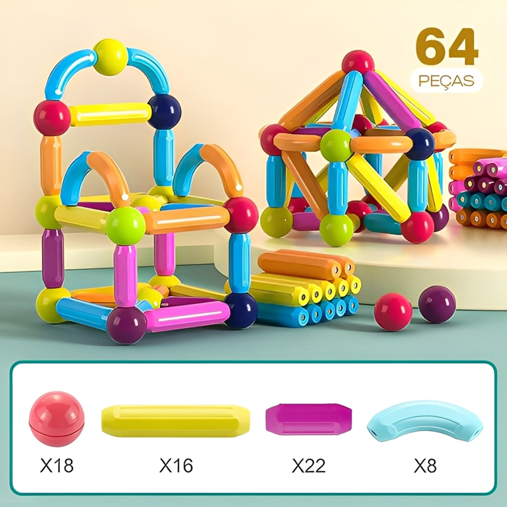 Com peças magnéticas coloridas e flexíveis, esse kit permite que as crianças criem formas, estruturas e figuras livremente, exercitando a imaginação e o raciocínio de forma divertida e segura.